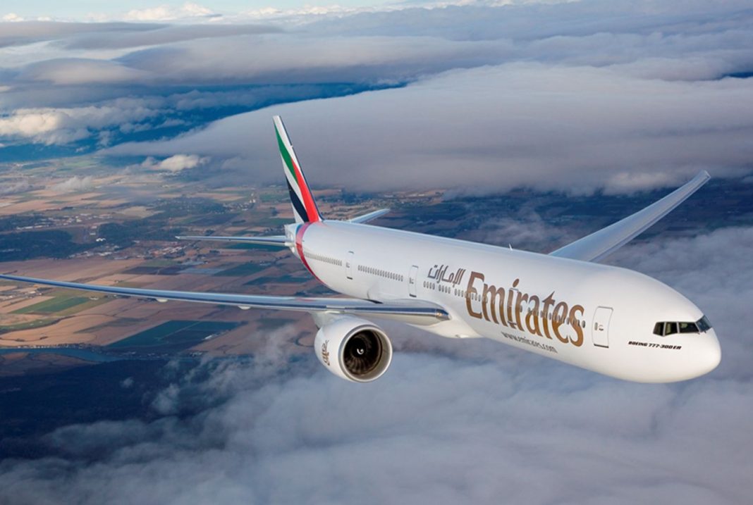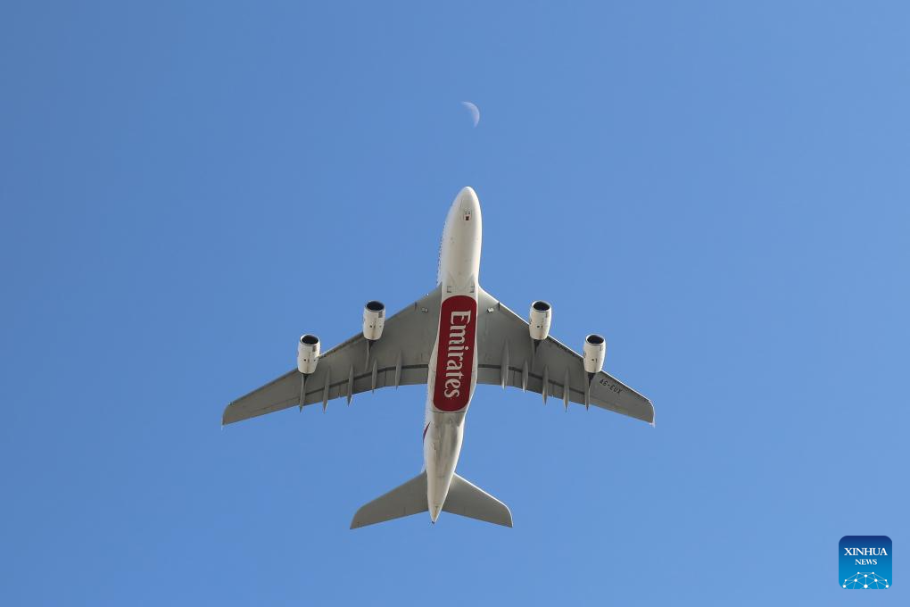 This photo taken on Jan. 5, 2025 shows an airplane of Emirates Airline flying in the sky. The United Arab...