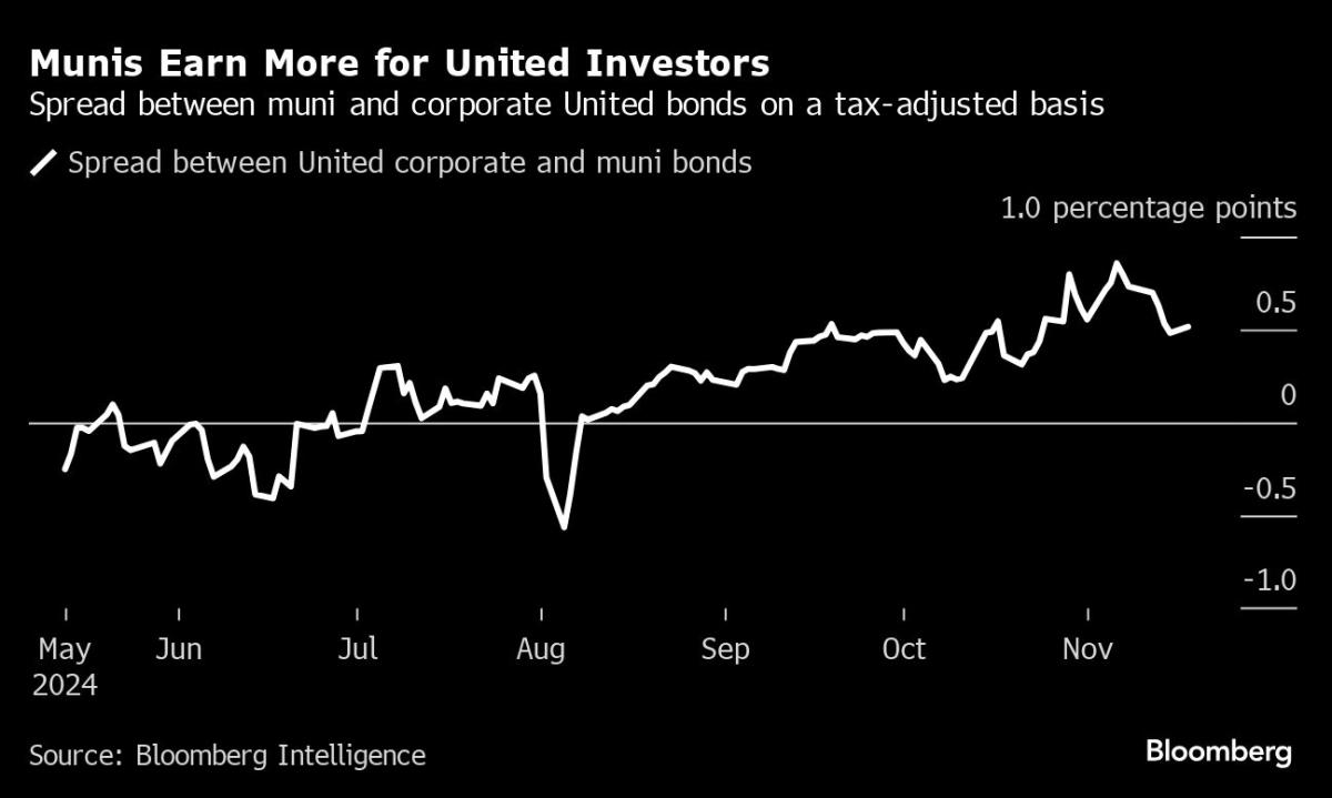 (Bloomberg) -- The municipal-bond market’s lagging run is opening up an opportunity for corporate-debt investors eager to secure extra yield....