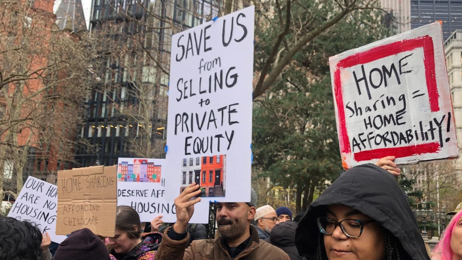 Rival rallies over proposed relief of restrictions on Airbnb and other short-term rental platforms faced off at City Hall Park...