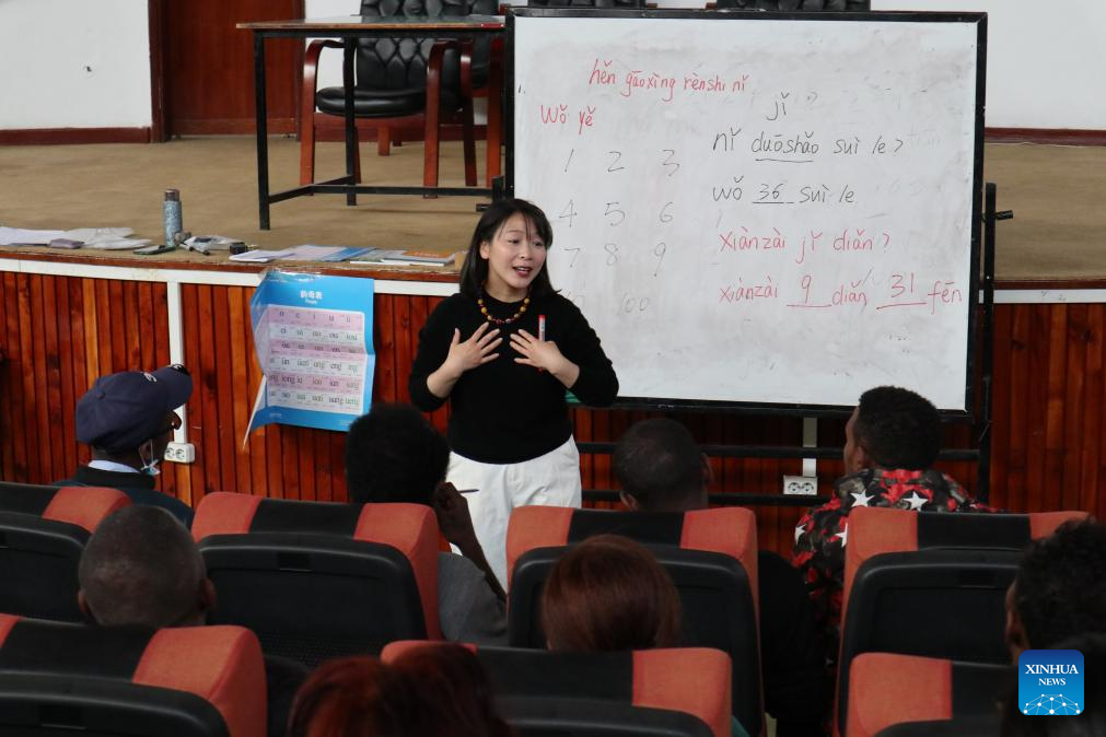 Song Ruirong, a Chinese teacher of the Confucius Institute at Addis Ababa University, teaches Chinese to Ethiopian tourism professionals at ...