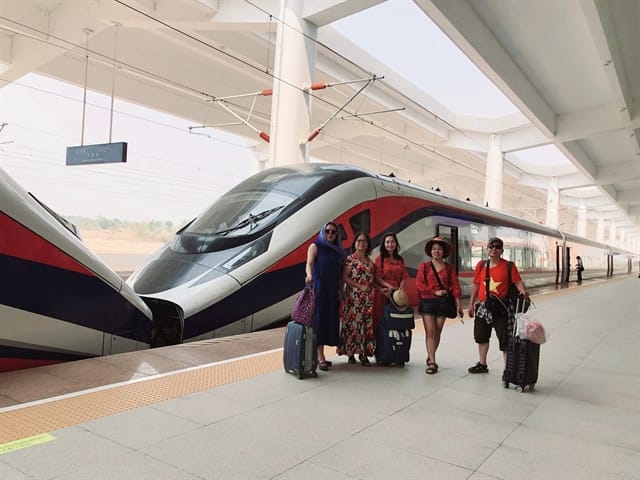 | ON TRACK: Vietnamese tourists pose for a photo with a Laos-China high-speed train. Photo courtesy of Dream Team |